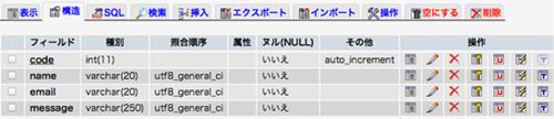データベースの作成 データベース名「mydb」 テーブル名「items」 カラム名 カラム型 (長さ) NOT NULL 制約 説明 id INT(11) ○ 書き込みの通し番号。主キー。自動採番にする name text ○ テーブルの構造を変更 フィールドを追加する テーブルの末尾に1個…